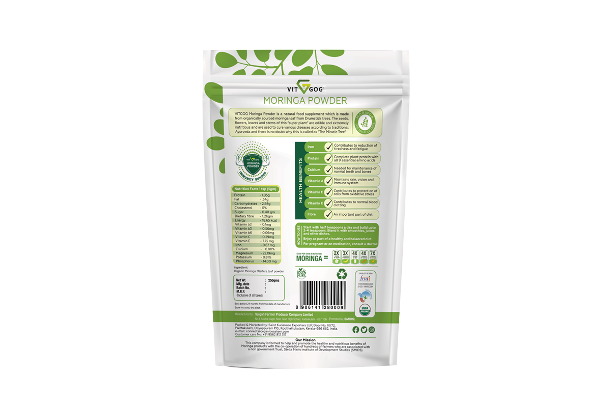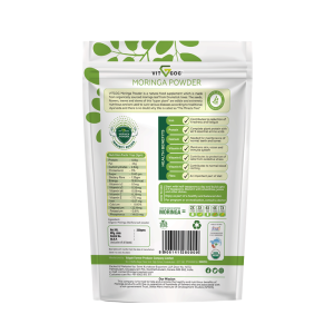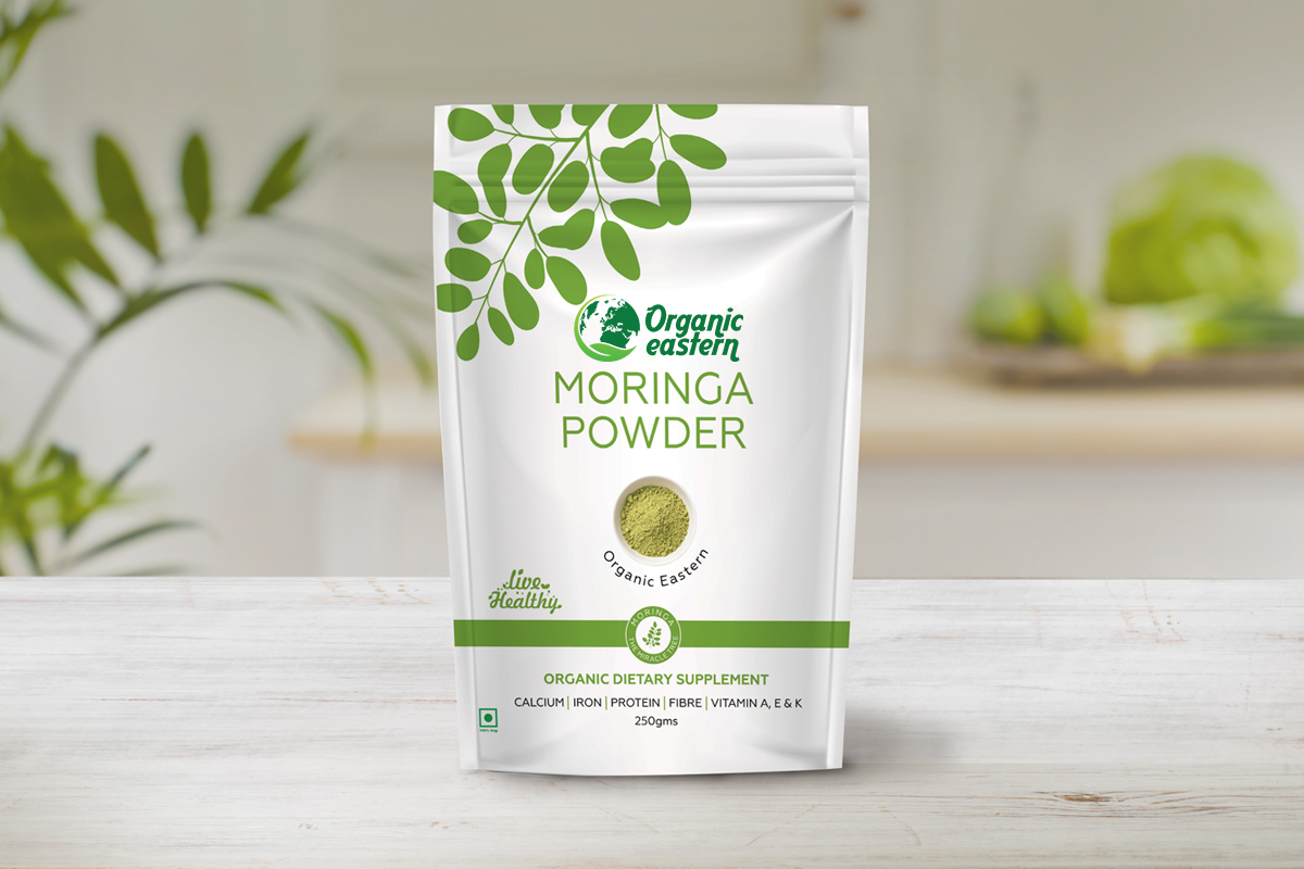 ORGANIC EASTERN Moringa powder contains Organic leaf powder of Moringa oliefera (Sahjan). The powder is produced by harvesting, drying then milling the leaves of Moringa oleifera.